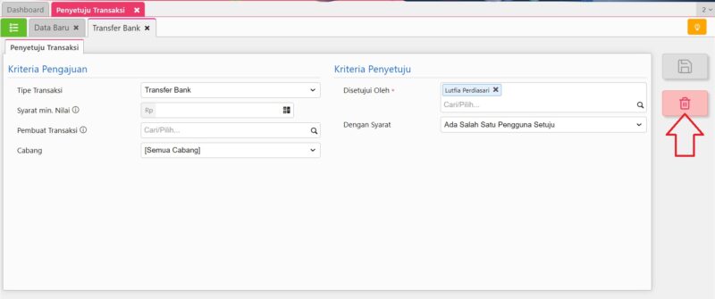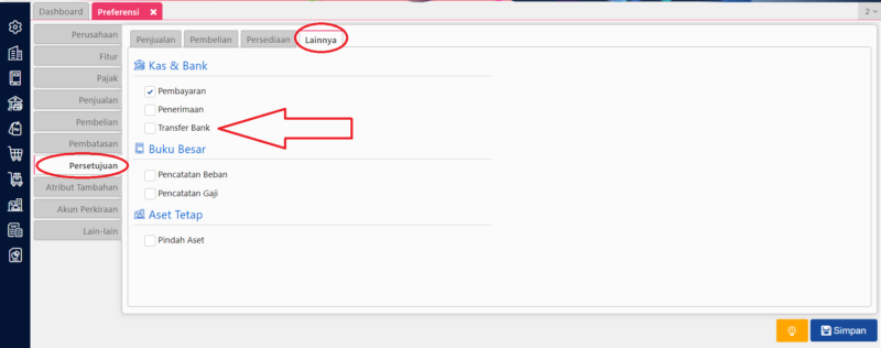 - Menghapus Pengaturan Penyetuju Transaksi untuk Transfer Bank melalui menu Pengaturan | Penyetuju Transaksi atau Menonaktifkan fitur Persetujuan Transfer Bank, yaitu melalui menu Pengaturan | Preferensi | Persetujuan lalu ke tab Lainnya, tidak centang Transfer Bank.