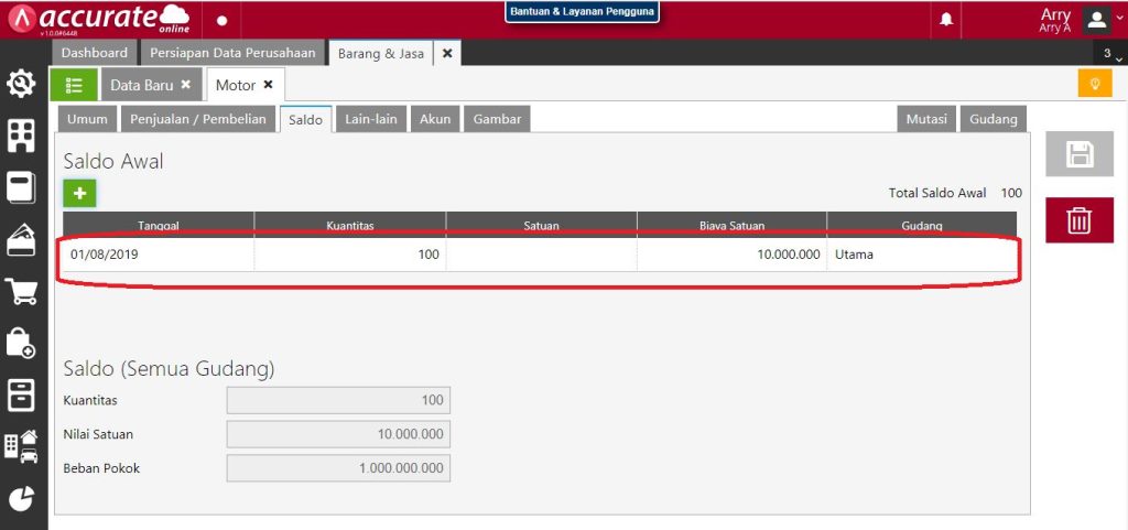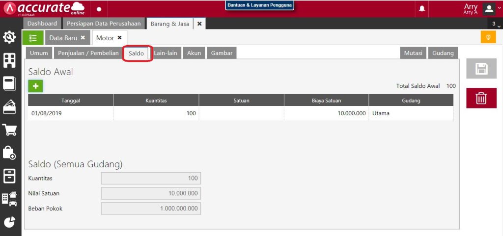 - Buka detail barang yang dimaksud kemudian ke tab Saldo.