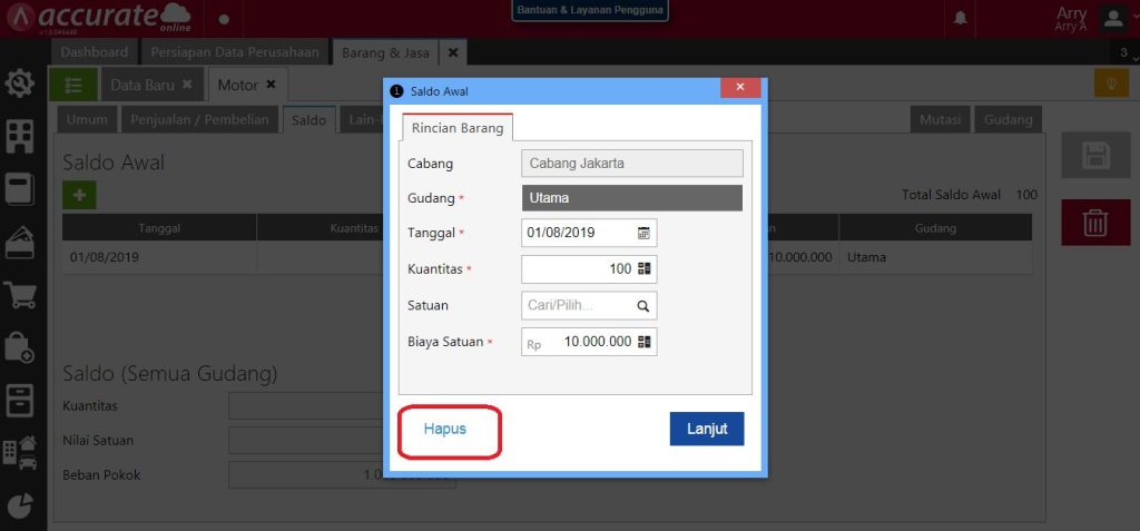 Memilih Nilai Saldo Awal Yang Akan Dihapus