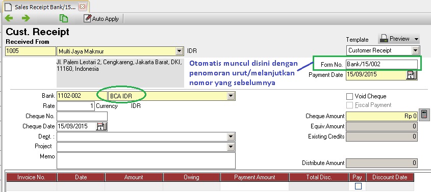 Sebagai contoh disimulasikan untuk akun BCA IDR, dimana field Next Invoice No nya diisikan dengan nomor : Bank/15/001