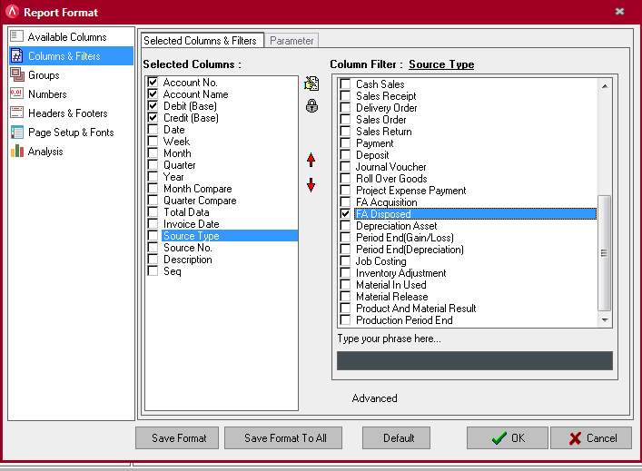 • Pada tab Selected Columns & Filters, di select kolom Source Type lalu pilih FA Disposed.