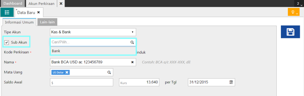 • Membuat Akun Perkiraan yang akan dijadikan anak dengan cara seperti pada panduan Membuat Akun Perkiraan, tetapi pada bagian Sub Akun, harap centang untuk mengindukan akun tsb ke akun yang akan dijadikan Induk.