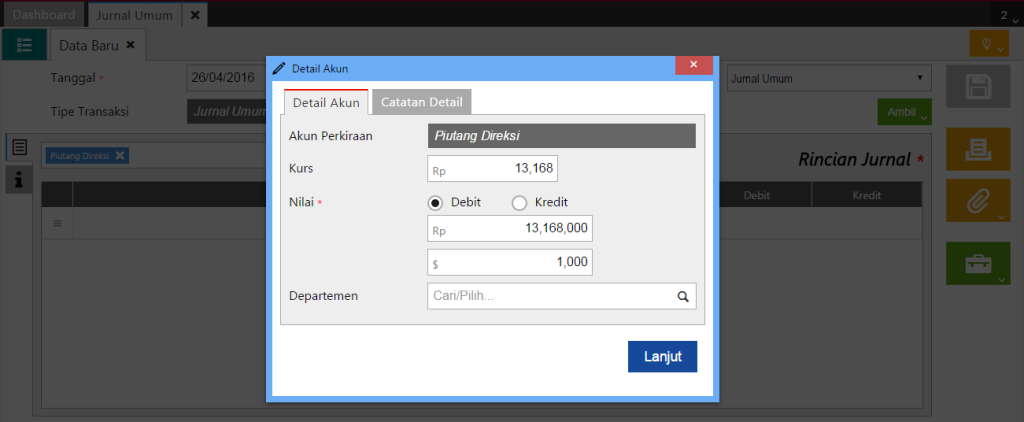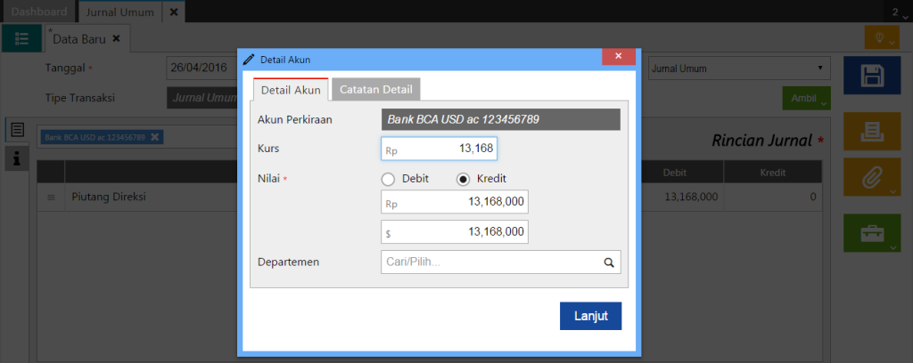 - Klik Lanjut, untuk memasukan lawan dari akun Piutang Direksi.