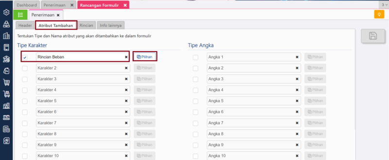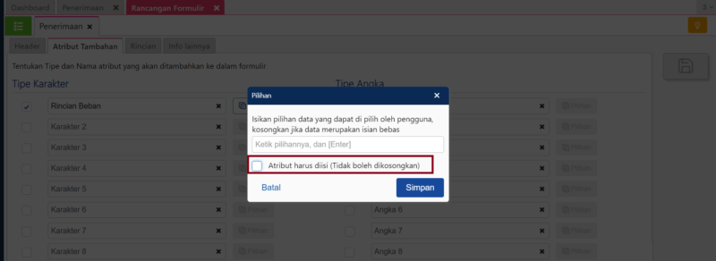 - Lalu ke Rancangan Formulir | Atribut Tambahan, lalu klik pada Nama Atribut Tambahan sesuai pesan error yang tampil, pada contoh adalah “Rincian Beban”.