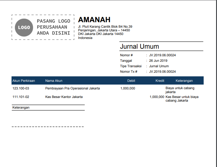 Jika Anda menggunakan Accurate Online, Anda dapat menambahkan dan menampilkan detail keterangan akun pada desain cetakan jurnal umum. Accurate Online memungkinkan Anda untuk menyesuaikan desain cetakan agar lebih sesuai dengan kebutuhan pelaporan dan audit perusahaan.