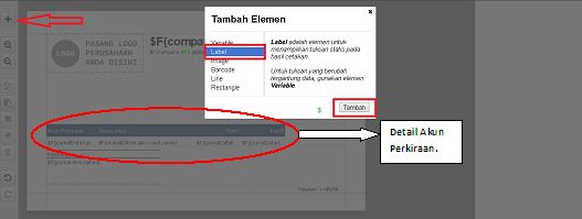 - Geser kolom yang berada pada bagian detail Akun Perkiraan, seperti No Akun, Nama Akun dan lainnya. Setelah itu klik (+), pilih Label dan klik Tambah.