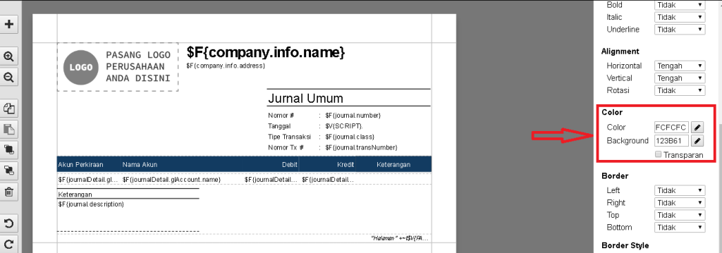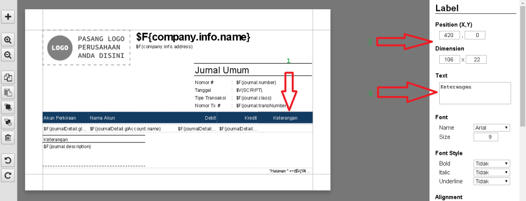 Berikut panduan menampilkan detail keterangan akun pada Desain Cetakan Jurnal Umum :