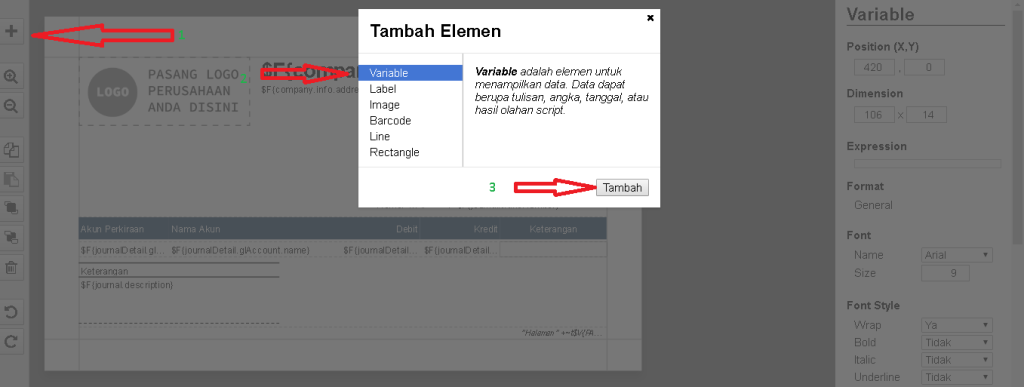 - Selanjutnya adalah menambahkan variable script pada kolom Keterangan, yaitu dengan meng-klik (+) pilih Variable lalu klik Tambah dan tempatkan dibawah Label Keterangan kemudian atur Position dan Dimension untuk kolomnya.