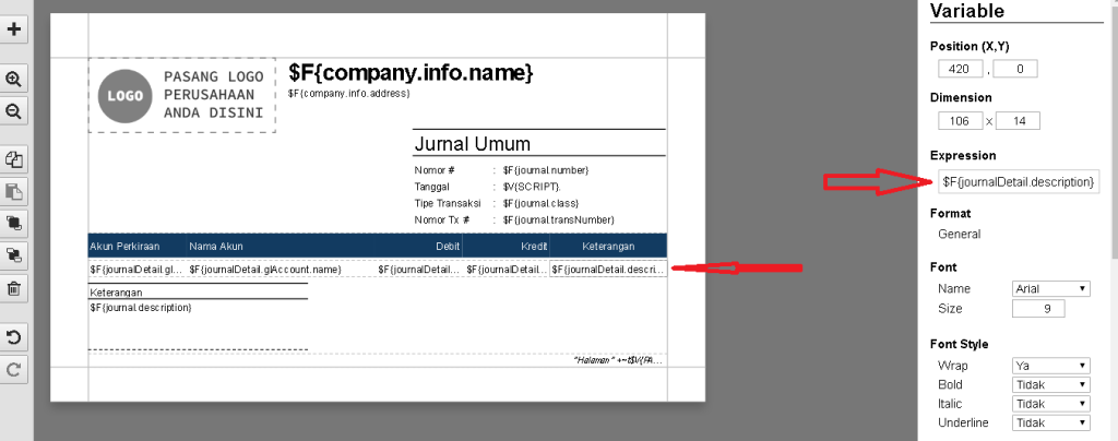 - Pada kolom Expression atas variabel yang baru ditambahkan tersebut masukan skrip: $F{journalDetail.description} dan simpan Desain Cetakan.