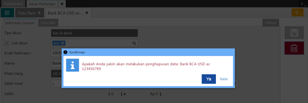 - Selanjutnya akan muncul konfirmasi penghapusan, Anda klik Ya untuk mengkonfirmasi penghapusan akun perkiraan tersebut.