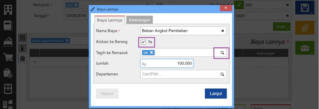 - Apabila pemasok barang dan pemasok pembayaran beban berbeda maka isi Tagih ke Pemasok dengan nama pemasok yang mengirimkan barang.