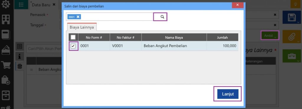 b. Pada tab Beban lainnya klik Ambil lalu klik Biaya Pembelian. Pilih beban yang akan di bayarkan lalu klik Lanjut.