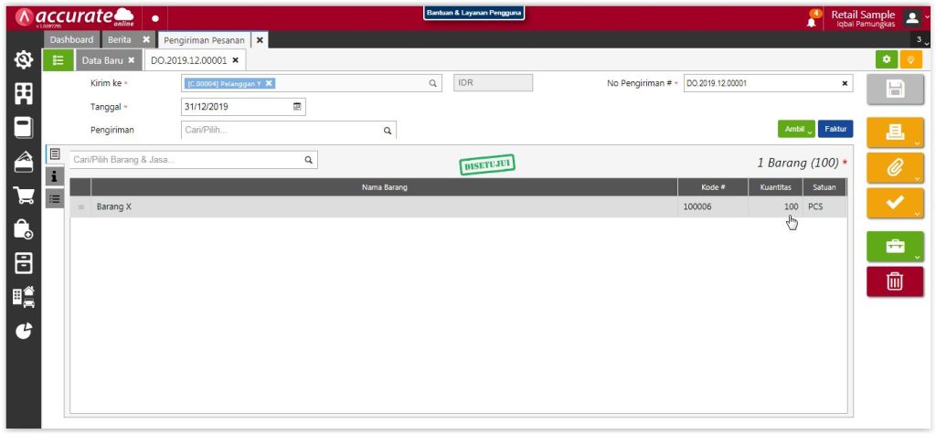 - Membuat transaksi Pengiriman Pesanan dengan mengambil dari Pesanan Penjualan di poin 1.