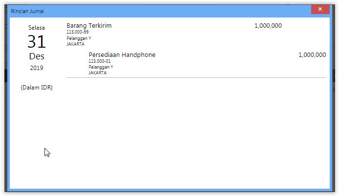 Ilustrasi : Perusahaan A memulai menggunakan Accurate Online per tanggal 31 Desember 2019 dan per tanggal tersebut masih terdapat transaksi Pengiriman Pesanan yang masih outstanding ke Pelanggan Y atas Barang X sebanyak 100pcs, @Rp10.000. Sehingga terdapat nilai saldo akun Barang Terkirim sebesar Rp 1.000.000.