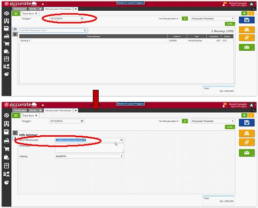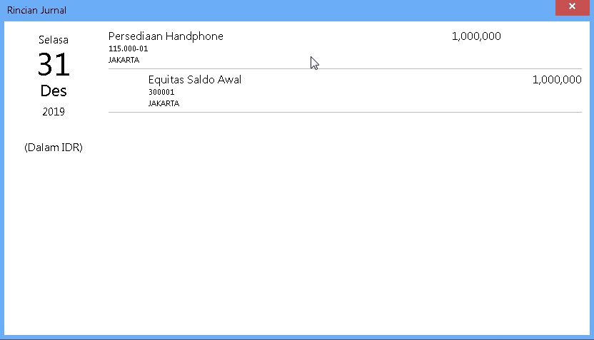 - Pembuatan transaksi Penyesuaian Persediaan (Penambahan), bertujuan untuk meng-nolkan nilai akun persediaan pada jurnal transaksi Pengiriman Pesanan (Poin 2). Sehingga pada akhirnya jurnal yang terbentuk adalah (Dr) Barang Terkirim pada (Cr) Ekuitas Saldo Awal sebesar Rp 1.000.000.