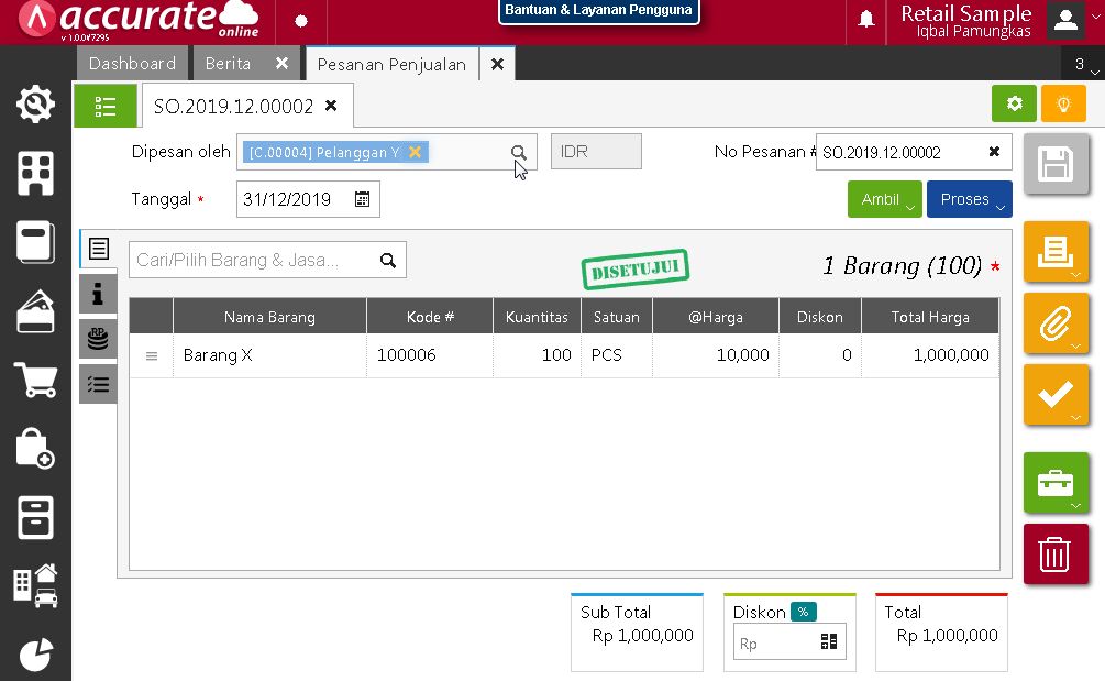 - Membuat transaksi Pesanan Penjualan ke Pelanggan Y dengan kuantitas sebesar 100 pcs @Rp 10.000, yang bertujuan untuk menghasilkan nilai Barang Terkirim sebesar Rp 1.000.000 saat membuat transaksi Pengiriman Pesanan.